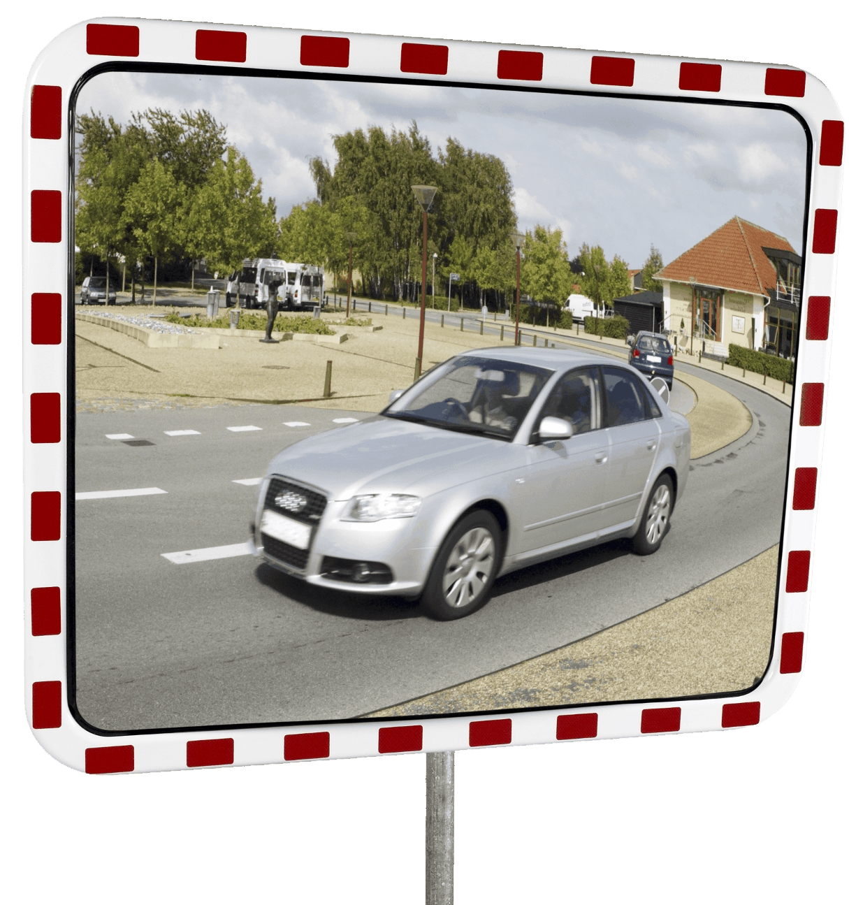 Dopravné zrkadlá majú vďaka bielemu rámu s červenou reflexnou fóliou RA2 oveľa lepšiu viditeľnosť, a teda menšie riziko nehôd.