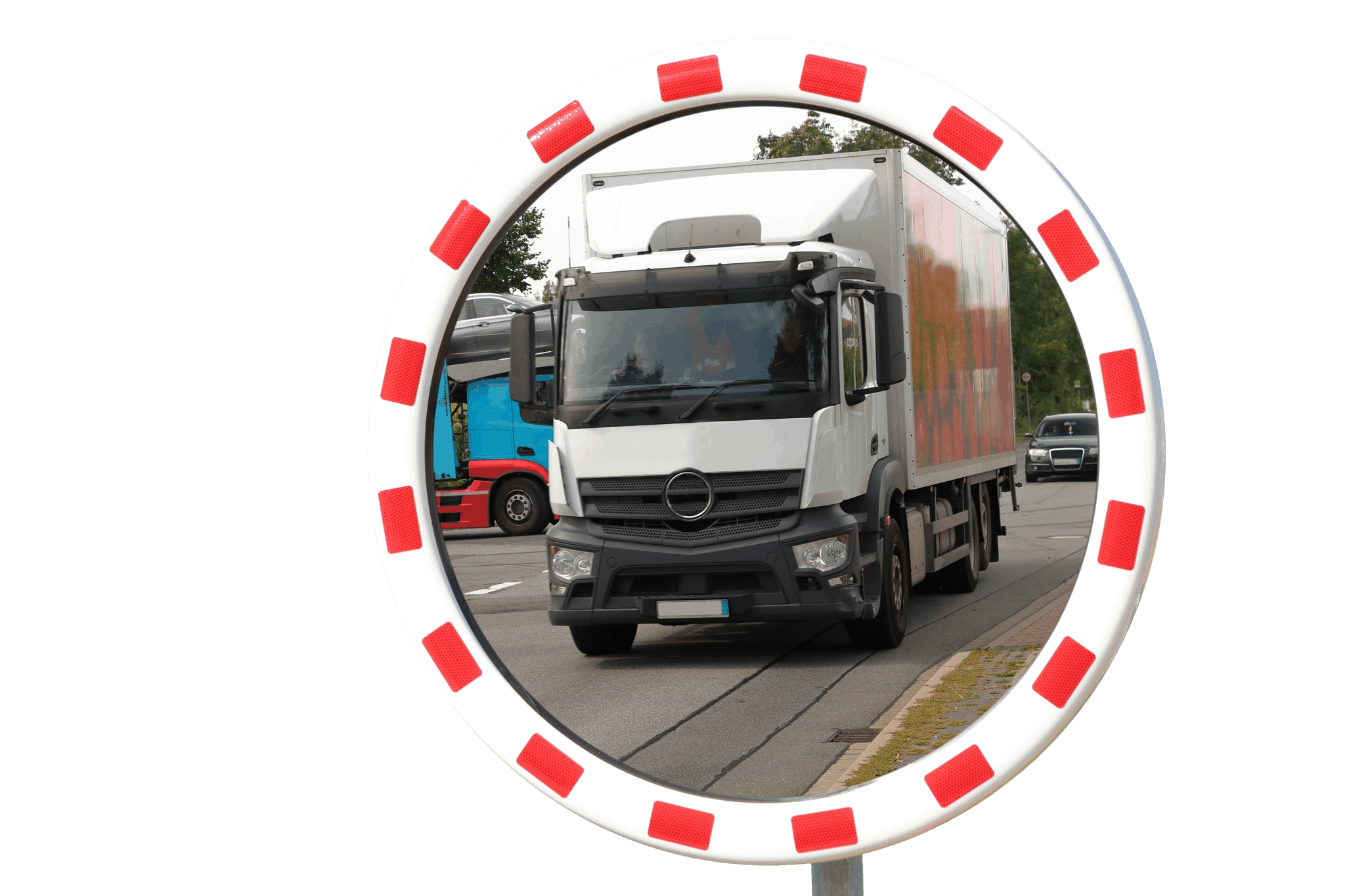 Dopravné zrkadlá majú vďaka bielemu rámu s červenou reflexnou fóliou RA2 oveľa lepšiu viditeľnosť, a teda menšie riziko nehôd.