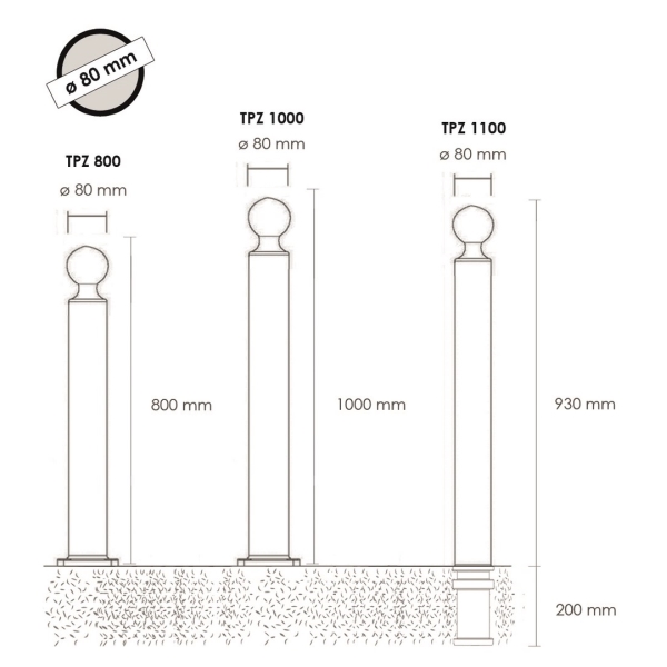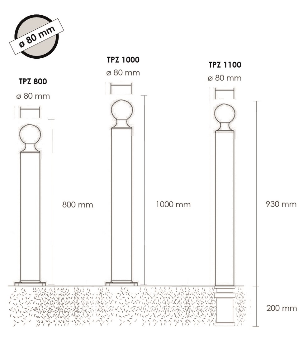 VI-TPZ1100RN | Flexibilný stĺpik k zabetónovaniu, výška 1130 (930) mm, pr. 80 mm, guľatá hlavica – čierna |