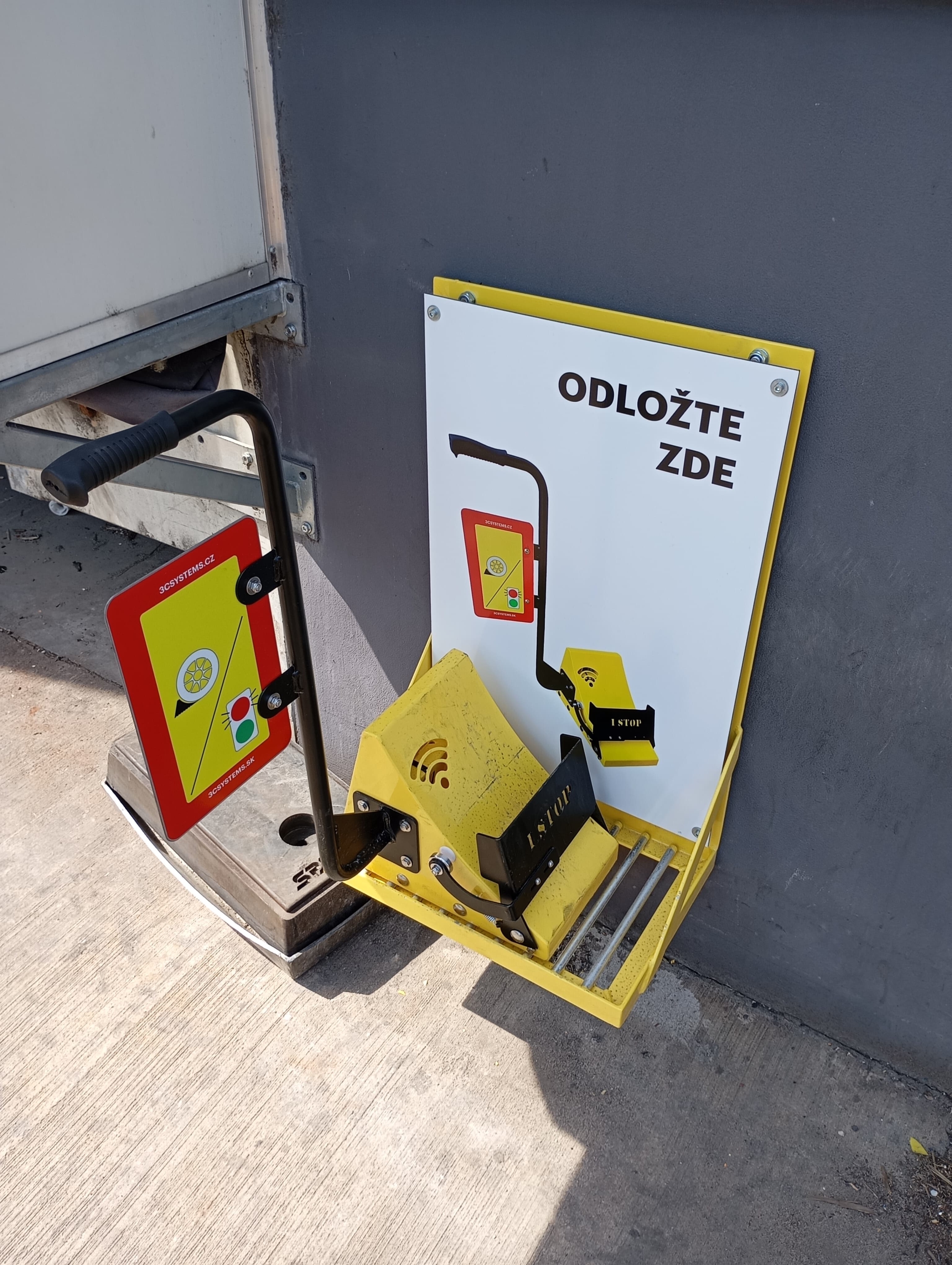 Zakladací klin pod kolesá s alarmom je vyrobený z kovu. Konštrukcia je bezdrôtovo prepojená s riadiacou jednotkou umiestnenou vo vnútri. Obsahuje aj zvukovú a svetelnú signalizáciu pomocou červených a zelených LED diód na vnútornej a vonkajšej strane. Je navrhnutý tak, aby eliminoval riziko predčasného opustenia nákladných vozidiel z nakladacích priestorov. Manipulácia s tovarom je preto možná až po umiestnení klina pod koleso nákladného vozidla, čo je zároveň podmienkou otvorenia rampových dverí. Túto konštrukciu možno deaktivovať otočením kľúča na riadiacej jednotke a systém možno používať aj pri nakladaní bez použitia dverí.