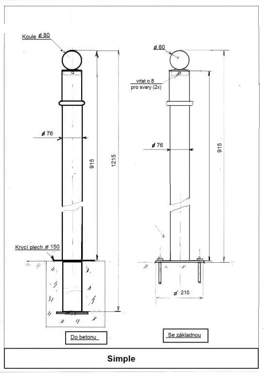Ozdobný stĺpik SIMPLE je ideálny pre pešie zóny, parky, historické centrá a moderné priestory. Stĺpik sa kotví priamo do betónového základu pomocou kotviacich skrutiek alebo pomocou montážnej pätky. Stĺpik SIMPLE je k dispozícii v týchto verziách: pevný na zabetónovanie, pevný s doskou a sklopný.