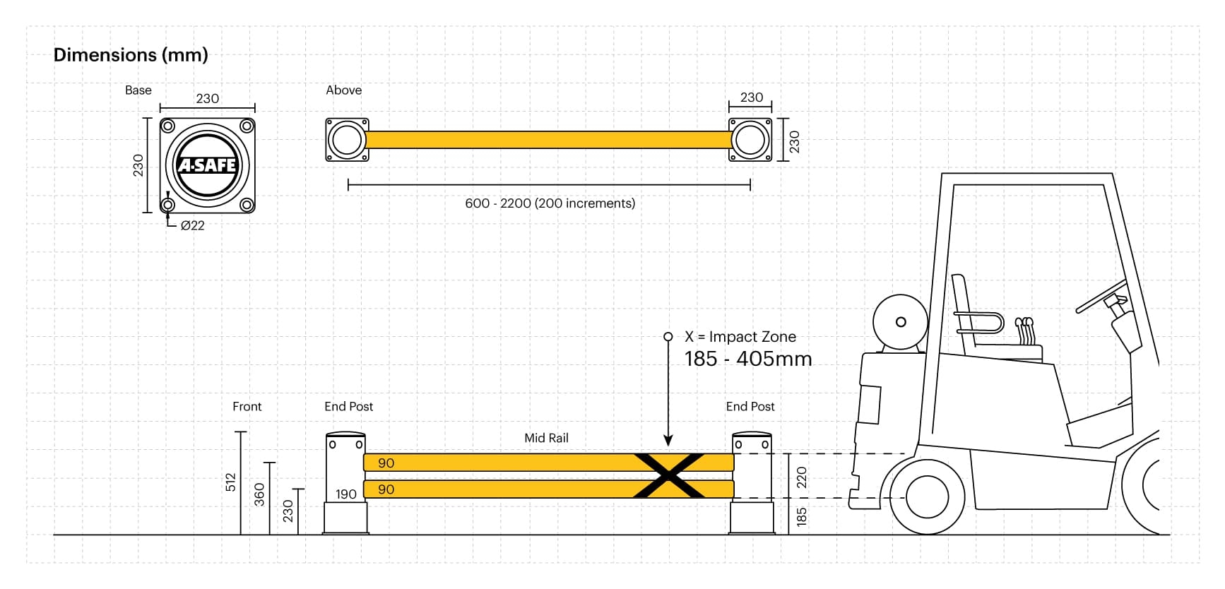 Podobne ako verzia s jedným stĺpikom, aj typ Double s dvojitým stĺpikom má zväčšenú dĺžku o 10 cm. To ponúka možnosť výberu dĺžky zábrany s malým presahom cez stĺpiky stojana. Ak chcete zabrániť nárazom vysokozdvižných vozíkov do podlahy v malých výškach, odporúčame kombinovať ho s typom ForkGuard.
