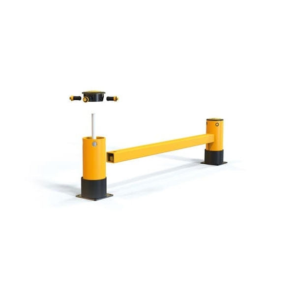 Ako názov napovedá, zábrana eFlex Single RackEnd Barrier sa skladá z jednej tyče a stĺpikov kruhového tvaru. Pätka stĺpika so zapustenými skrutkami, kruhový tvar stĺpika a otočné dvojité opláštenie stĺpika umožňujú ľahký prechod zariadenia do regálovej uličky.