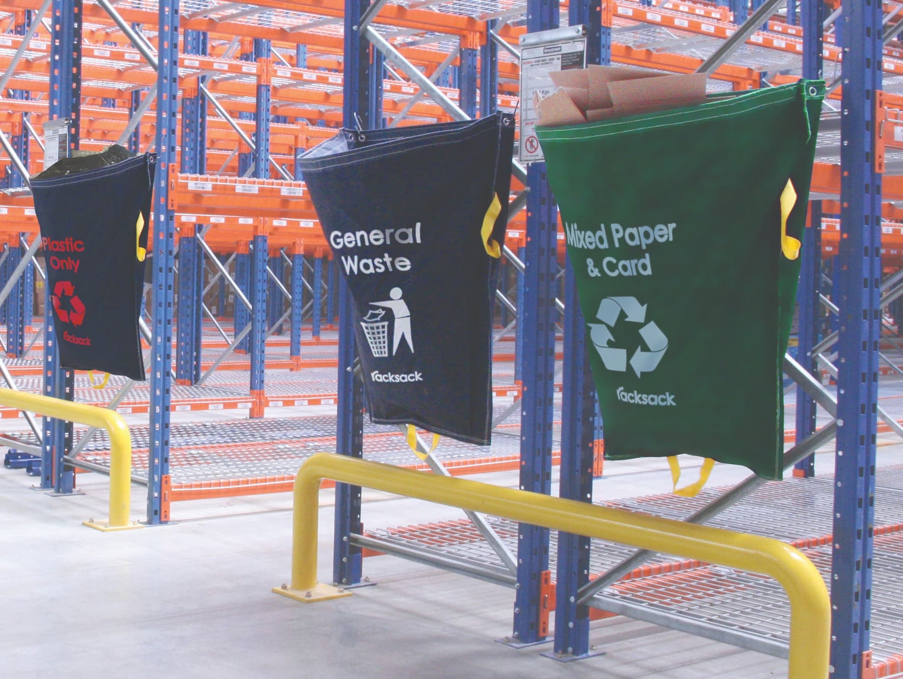 RackSack je vhodný do väčšiny regálových systémov a políc so šírkou od 900 mm do 1100 mm. Vrecia na triedenie odpadu sa pripevňujú na koniec regálových rámov, čím sa šetrí miesto.